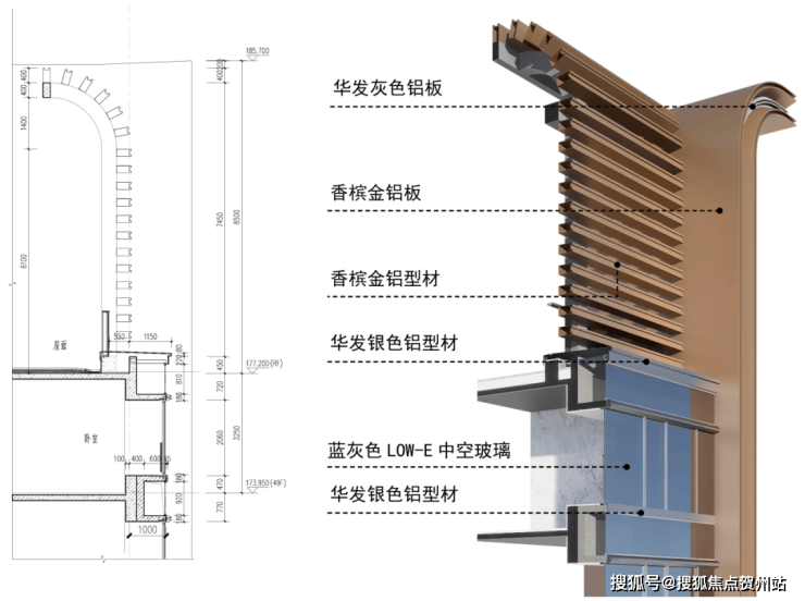 华发灰与香槟金双色铝板组合拼接,形成色彩丰富且具有视觉冲击力的平面序列,增加光影下的建筑层次感。