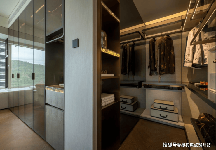 在主卧,除了配置步入式衣帽间,额外预留了一个嵌入式整排衣柜的收纳空间外,而且细分出更多功能区, 让整个空间的动线与空间变得更有情趣 。比方我们看到空间内放置了小冰箱,打造一个迷你水吧台,男女主人恰恰小酒,看着窗外城市美景, 定制专属于星级奢华酒店的松弛感氛围 。