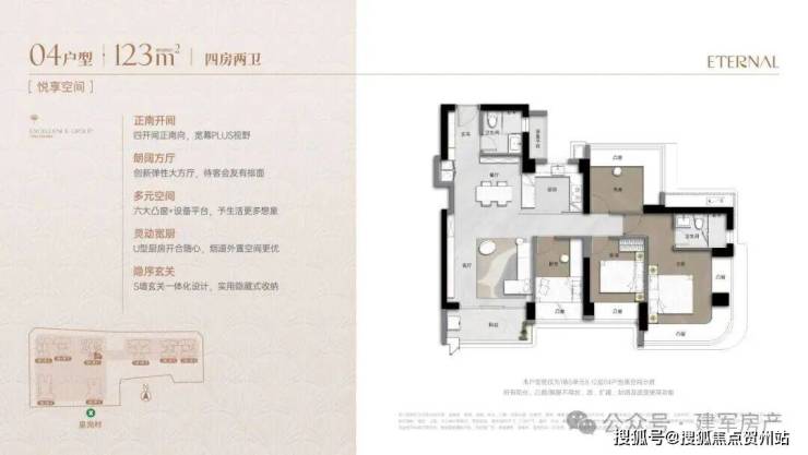 173m²的4房2厅3卫+家政间,竖厅类双龙抱珠格局,独立电梯厅入户约8.13㎡,客厅5.55米开间,LDKB一体化设计,主卧套房270°环幕凸窗+私享阳台,八大凸窗+设备平台+家政间,U型厨房,公卫三段式干湿分离。阳台正北朝向看会展中心+市民广场,得房率76%(不含赠送,套内面积131.98㎡)。