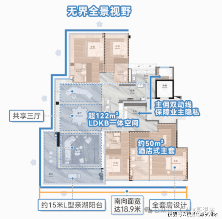 约18.9米南向面宽,奢阔层高享受,约122方定制化多功能社交巨厅,15米转角阳台,一线观湖