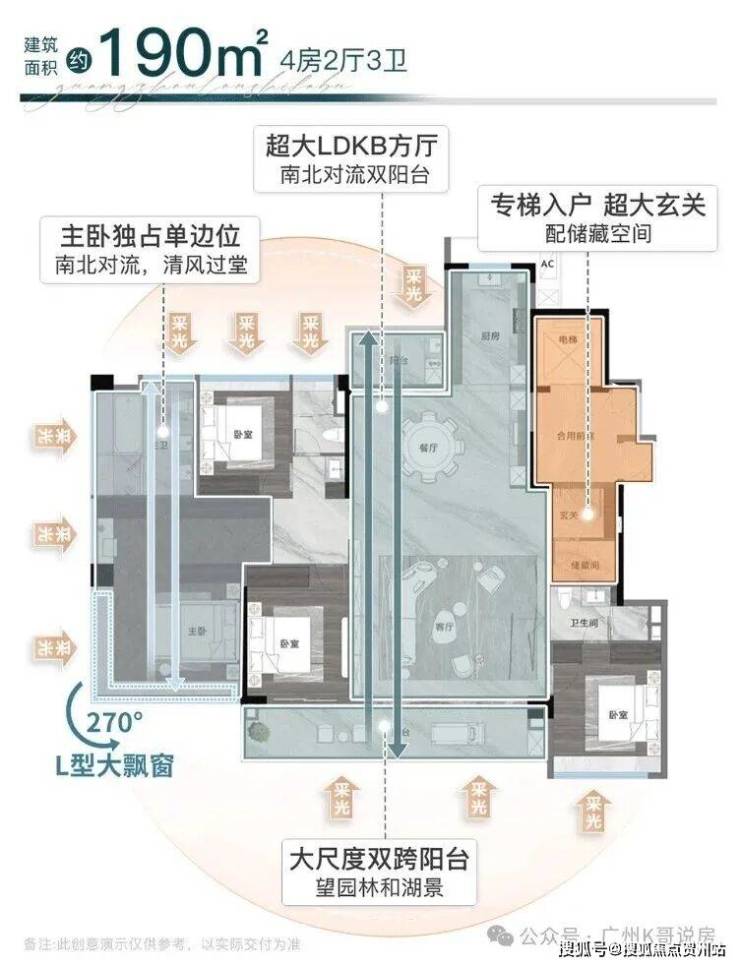 3、窗地比高达38%,主卧设置270°大飘窗。
