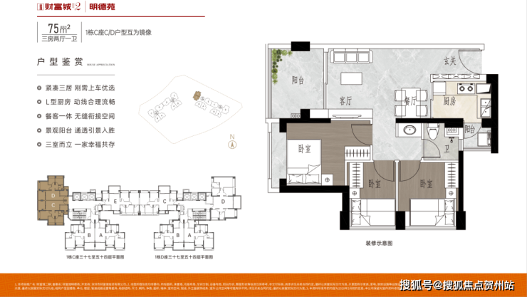 75㎡的3房2厅1卫,折后总价195-209万,折后单价2.6-2.76万/m²。