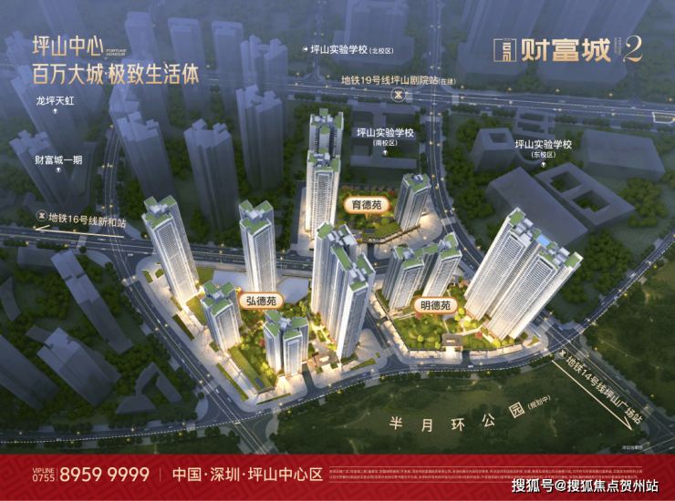 财富城2期所在的区位是整个坪山最核心的地段,汇聚了高铁+14/16号线双地铁+坪山实验学校+坪山中心公园+坪山天虹商场+坪山区政府+坪山体育中心+坪山图书馆,文艺馆等等,所有的市政配套基本都集中在这里,并且财富城2期也是该核心区域内唯一在售的新盘。