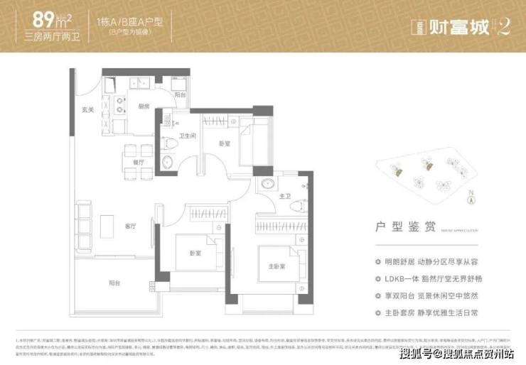 89㎡的3房2厅2卫,设计的是经典竖厅格局,客厅实测3.2米开间,LDKB一体化设计,动静分区,分别做到了主卧12.35㎡/次卧8.22㎡/次卧6.19㎡(实测面积,去掉墙体),L型厨房,卫生间干湿分离,带1个小生活阳台,得房率约:72.3-77.7%(不含赠送),西南或东南朝向。赠送面积8.3㎡,加上赠送得房率81.63-86.9%。